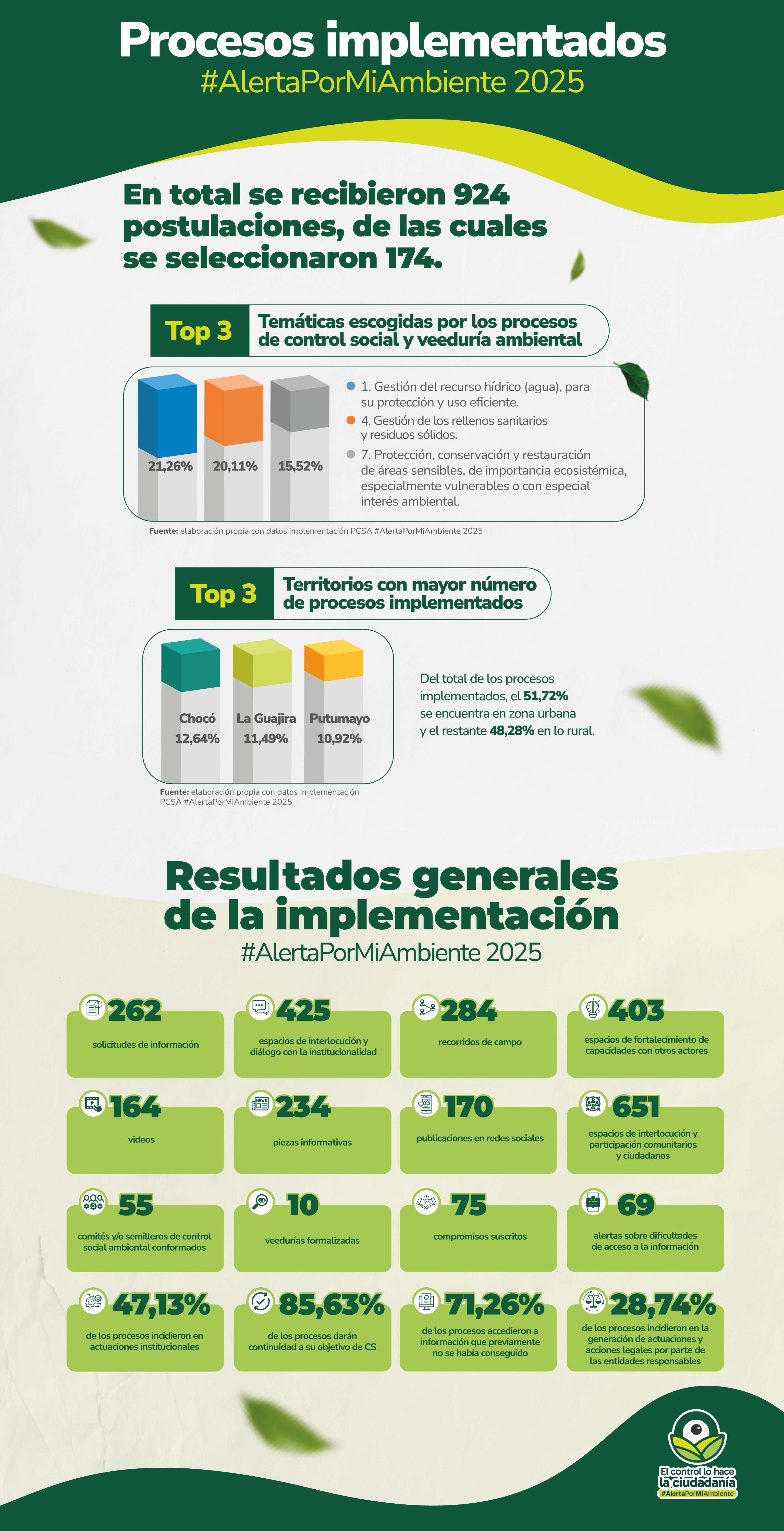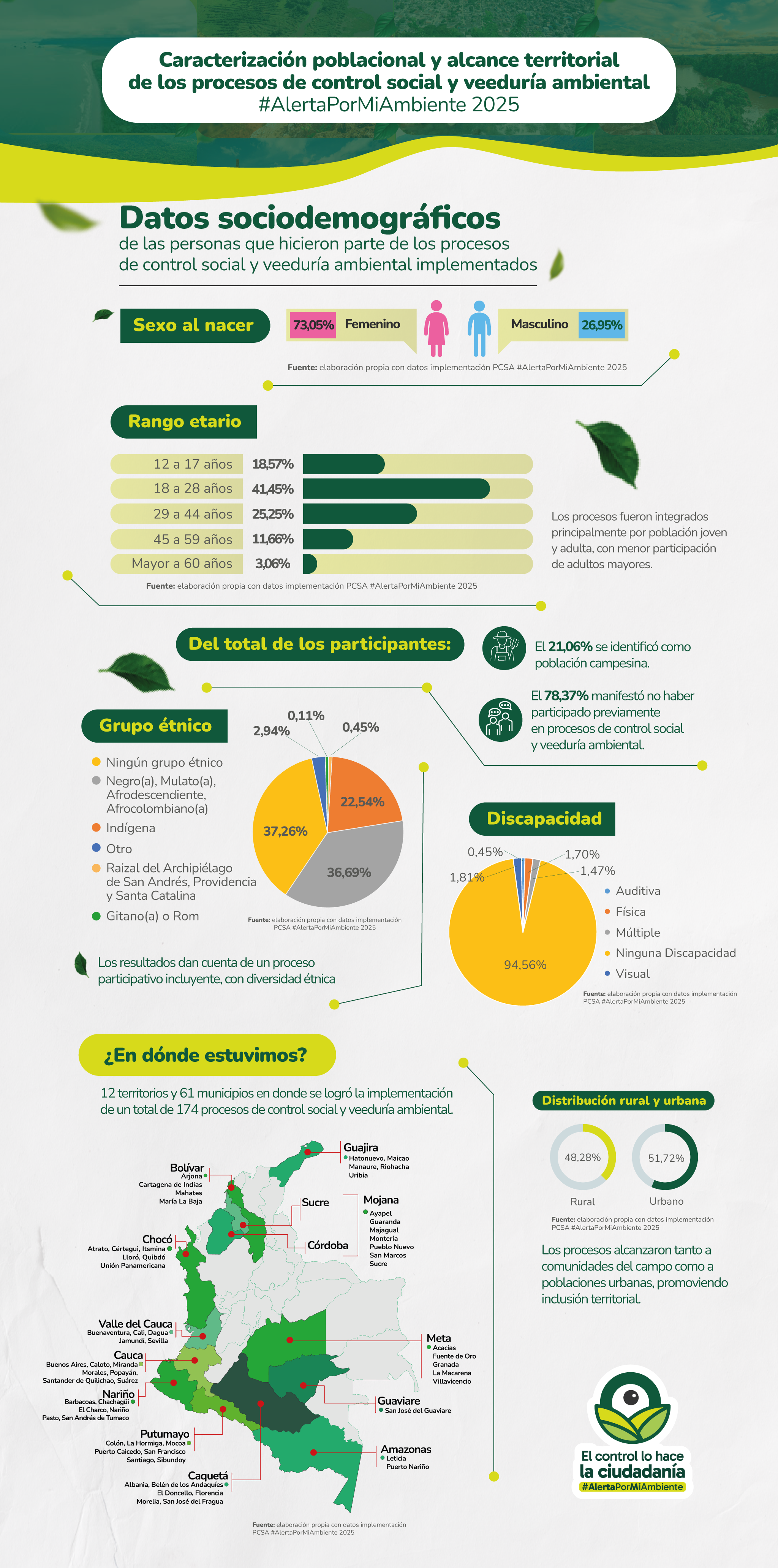 Durante 2025, el programa se consolidó y amplió su alcance a 12 territorios del país —Cauca, Valle del Cauca, Bolívar, Nariño, La Guajira, Chocó, Amazonas, Putumayo, Mojana, Guaviare, Meta y Caquetá— mediante la implementación de 174 procesos de control social ambiental, seleccionados a través de una convocatoria pública, abierta y transparente.